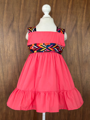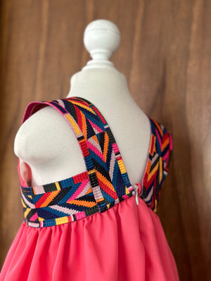 Vestido con vuelo color coral con detalle en contura y tirantes de tira etnica.