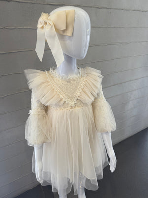 Vestido infantil en tono beige, de estilo elegante y delicado, ideal para ocasiones especiales como bodas, bautizos o celebraciones. Confeccionado en una tela suave y ligera, incorpora detalles en encaje que aportan un toque romántico y sofisticado. Las sutiles transparencias en las mangas le dan un aire moderno sin perder la ternura propia de una prenda infantil. Su corte cómodo y su caída fluida permiten libertad de movimiento, combinando estilo y confort a la perfección.